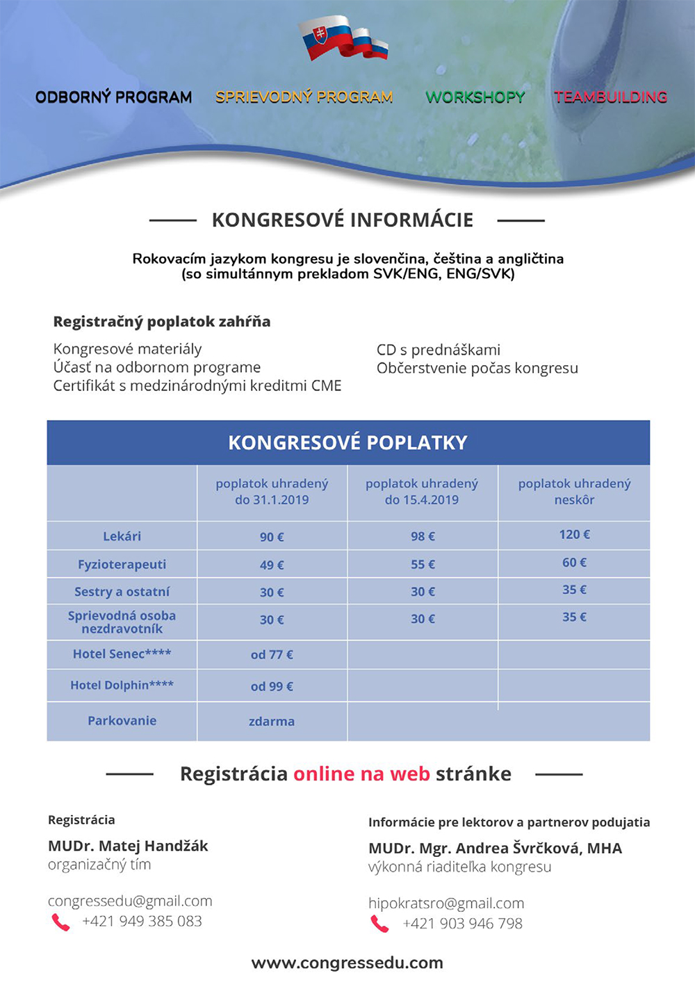 Názov prednášky, autor, spoluautor, zasielajte výlučne elektronicky do 31.3.2019 na adresu congressedu@gmail.com, prípadne hipokratsro@gmail.com. Abstrakty je možné doručiť na uvedenú adresu do 25.4.2019. Pri zasielaní prezentácií a abstraktov prosíme tiež o uvedenie súhlasu či nesúhlasu s možnosťou kopírovania údajov pre účastníkov kongresu na CD, prípadne doručenie medializovateľnej verzie prezentácie. Abstrakty so súhlasom k uverejneniu, budú po skončení kongresu uverejnené na web stránke SOV a tiež na stránke SZĽH v sekcii medicína a hokej. Počet a rozsah aktívnych prezentácií je limitovaný a jeho odsúhlasenie je v kompetencii organizátora.